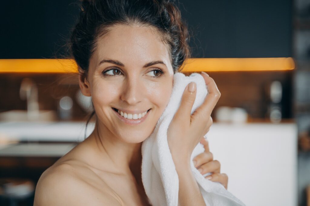 Zacznij od podstaw. Zastosuj delikatne, ale skuteczne oczyszczanie dwuetapowe wieczorem. Najpierw usuń makijaż i filtry, potem umyj twarz żelem dopasowanym do typu cery. Rano ogranicz się do lekkiego odświeżenia skóry – nie musisz jej mocno szorować i trzeć po nocy. Do mycia twarzy najlepiej użyj letniej wody. Zbyt gorąca nasila rozszerzenie naczyń i może pogłębiać rumień. Osusz twarz miękkim ręcznikiem, przykładając go delikatnie do skóry. To drobiazg, ale w zasadzie właśnie takie detale budują efekt.